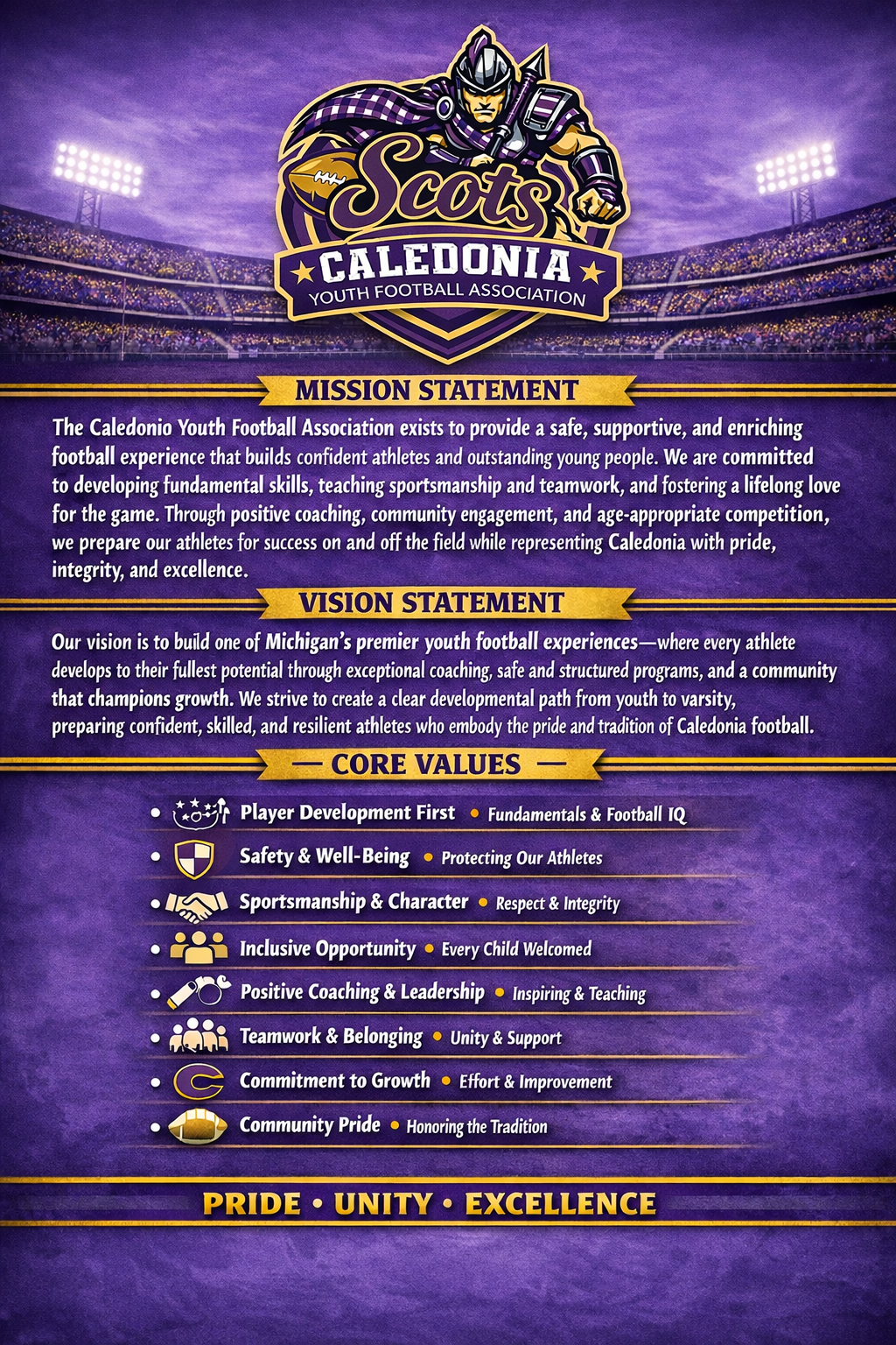 The Caledonia Youth Football Association was formed by local families and volunteers with a shared goal of providing a safe, organized, and development-focused football program for the community’s youth. Over the years, CYFA has grown alongside Caledonia—expanding participation, strengthening partnerships with local schools and coaches, and continually raising standards for player safety, coaching education, and program quality. Today, CYFA remains committed to its founding purpose: building strong athletes, strong teams, and strong futures for Caledonia’s young players.